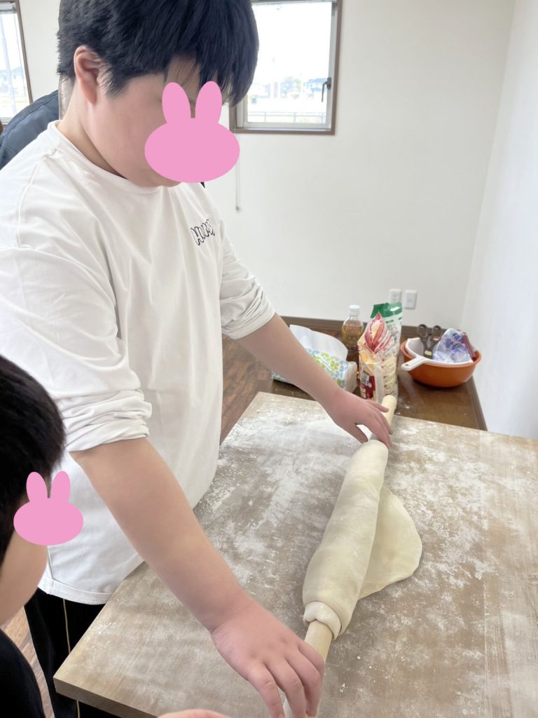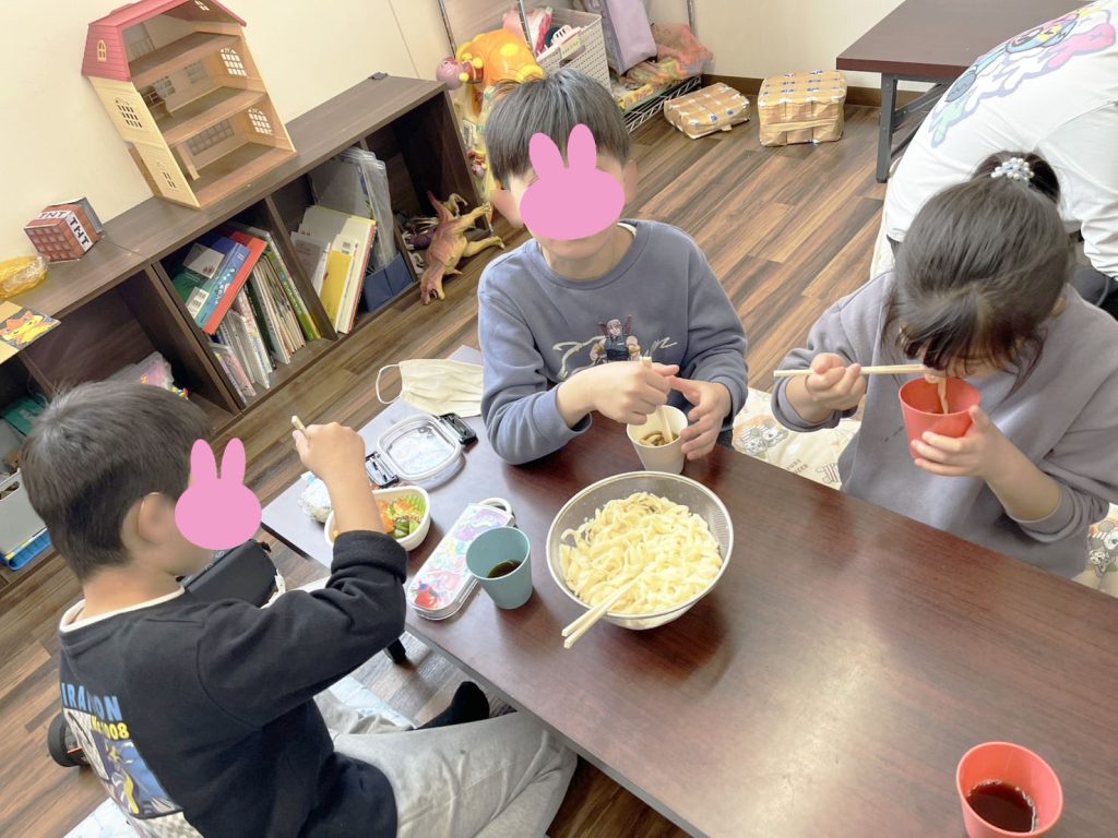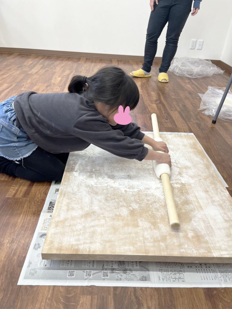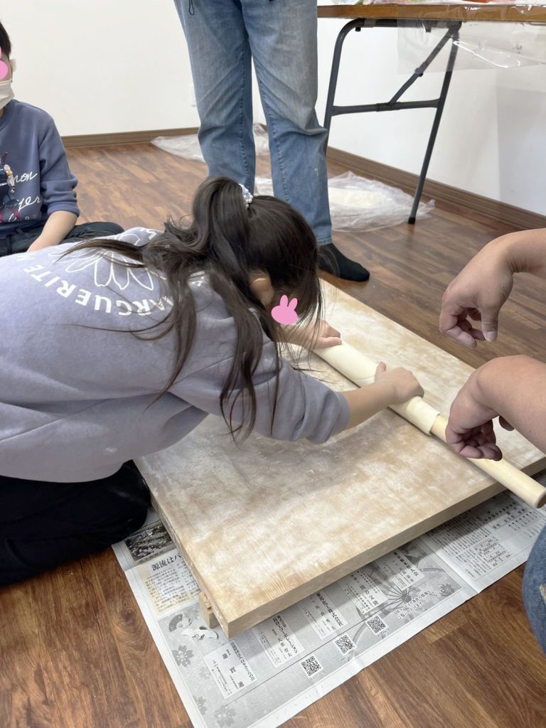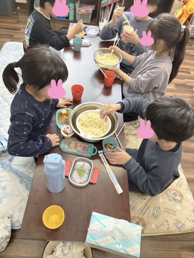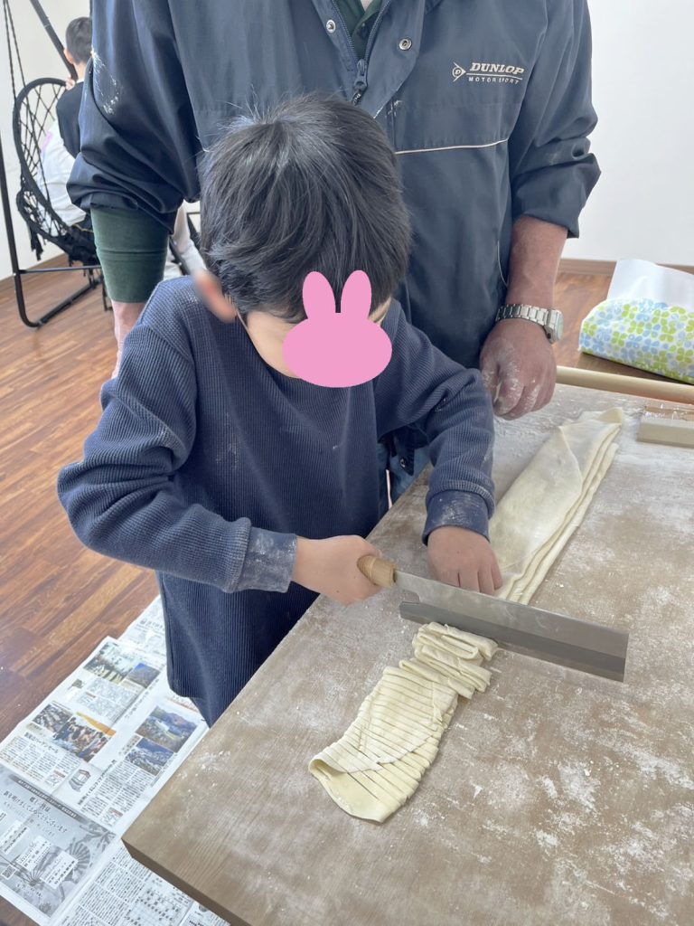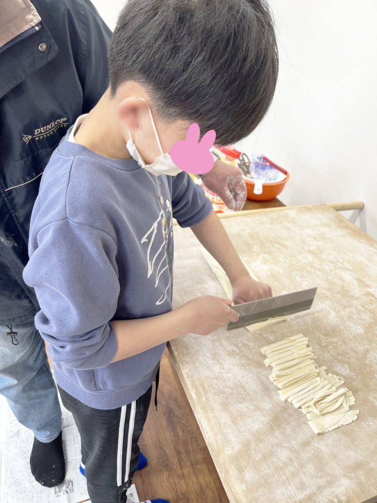 今日はうどん作りをしました!みんな初めての「うどん作り」でした♪生地をこねて作るところから、足でフミフミして切るところまでやりました(・`◡´・)自分たちで作ったうどんは、美味しかったようでたくさんおかわりをしていました!